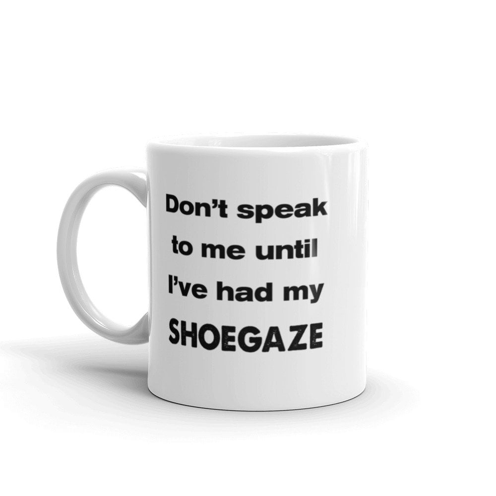 "Don’t speak to me until I’ve had my SHOEGAZE". Relevant, relatable. Combine two passions in one with our staff-approved coffee mug. But it’s not limited to coffee. You can put tea in it. You can put liquid in it. Even very small rocks. But you can’t put shoegaze in it. *shrugs*